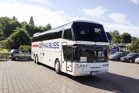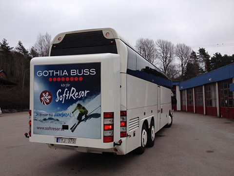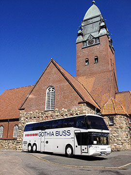 En av våra bussar vid Masthuggskyrkan i Göteborg